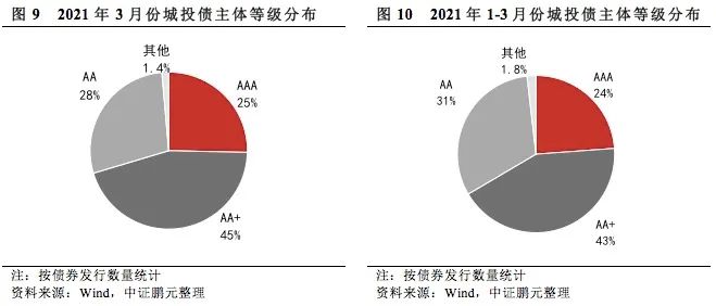 高級(jí)別主體發(fā)債占比上升,主體評(píng)級(jí)中樞明顯上移:3月份,發(fā)行主體在AA+級(jí)及以上的城投債占比合計(jì)為70%,較上月增長(zhǎng)6.3個(gè)百分點(diǎn),主體信用級(jí)別中樞大幅上移。綜合1-3月份情況來看,發(fā)行主體在AA+級(jí)(含)以上等級(jí)的城投債合計(jì)占比67%,與2020年主體級(jí)別中樞持平。