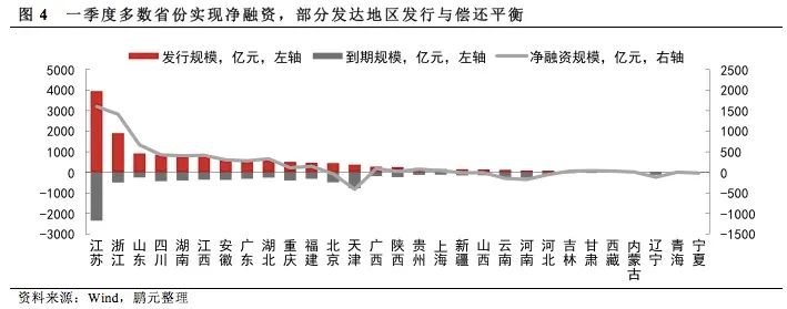 綜合1-3月份的情況來看,天津市和河南省仍是主要凈償還區(qū)域。云南省和遼寧省的凈償還規(guī)模也超過100億元。凈發(fā)行規(guī)模較大的省份主要位于東部沿海地區(qū)和中西部核心省份。江蘇、浙江兩省的凈發(fā)行規(guī)模均超過千億。四川、重慶兩地的凈發(fā)行規(guī)模分別達(dá)到423億元和111億元。同時(shí),部分經(jīng)濟(jì)發(fā)達(dá)地區(qū)如北京和上海的城投債發(fā)行與償還趨于均衡,以城投債資金進(jìn)行基礎(chǔ)設(shè)施建設(shè)的需求較低。