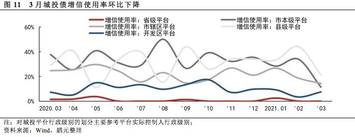 城投債增信使用率環(huán)比下降,城投債融資環(huán)境較好:3月份,城投債總體增信使用率為11.85%,較2月份環(huán)比下降6.1個(gè)百分點(diǎn)。就不同行政級(jí)別的主體來看,3月份除開發(fā)區(qū)平臺(tái)的增信使用率有所上升以外,其他級(jí)別城投平臺(tái)的增信使用率均環(huán)比下降。由數(shù)據(jù)可知,2020年末城投債融資環(huán)境整體較好。
