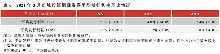 2021年3月份,無增信城投債的最高發(fā)行利率為8.00%,與上月持平;最低發(fā)行利率為3.40%,較上月上行80BP,利率區(qū)間收窄。自2021年初以來,央行逐步收緊流動(dòng)性并逐漸傳導(dǎo)至城投債一級(jí)市場(chǎng),導(dǎo)致1月和2月份城投債發(fā)行利率整體上行,但從目前來看流動(dòng)性因素基本出清,高級(jí)別城投債發(fā)行成本企穩(wěn)下行。分級(jí)別來看,無增信AA級(jí)、AA+級(jí)、AAA級(jí)城投債的平均發(fā)行利率較2月份分別上行1BP、下行33BP、下行22BP,發(fā)行利差分別擴(kuò)大2BP、收窄28BP、收窄21BP。城投短期融資券品種(含超短融)的利率全線下行,利差呈現(xiàn)漲跌互現(xiàn)趨勢(shì)。