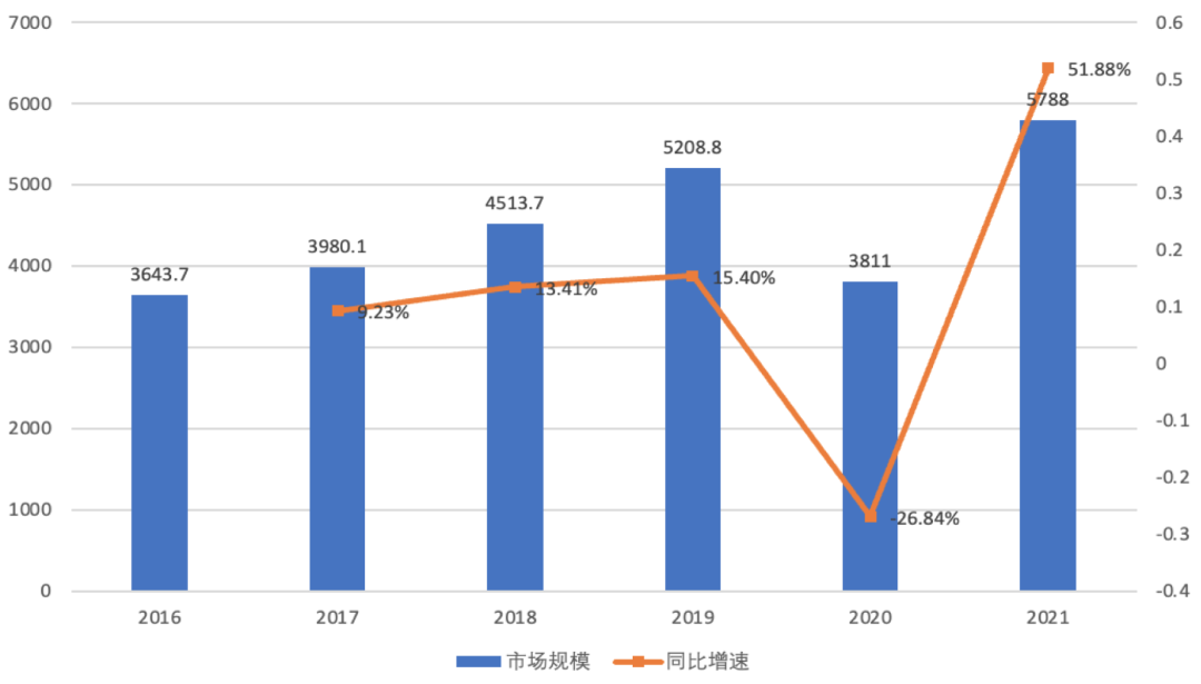 圖:2016年-2021年中國(guó)冰雪行業(yè)市場(chǎng)規(guī)模(單位:億元)