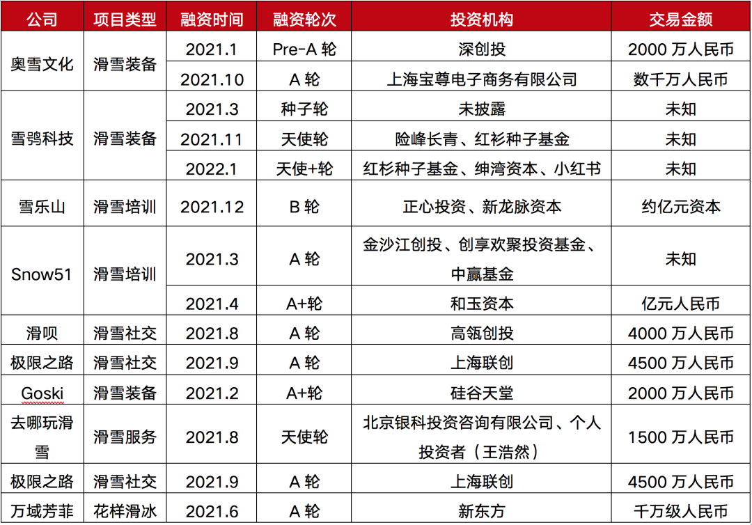 根據(jù)不完全統(tǒng)計(jì),冰雪賽道歷年來(lái)發(fā)生投融資共計(jì)34.12億元,發(fā)生融資行為59起。融資賽道主要集中在冰雪產(chǎn)業(yè)中的滑雪品類,以專注于滑雪裝備、滑雪培訓(xùn)和滑雪社交平臺(tái)的品牌為主要投資項(xiàng)目。在投融資層面,資本對(duì)雪經(jīng)濟(jì)的追捧力度遠(yuǎn)大于冰產(chǎn)業(yè)。