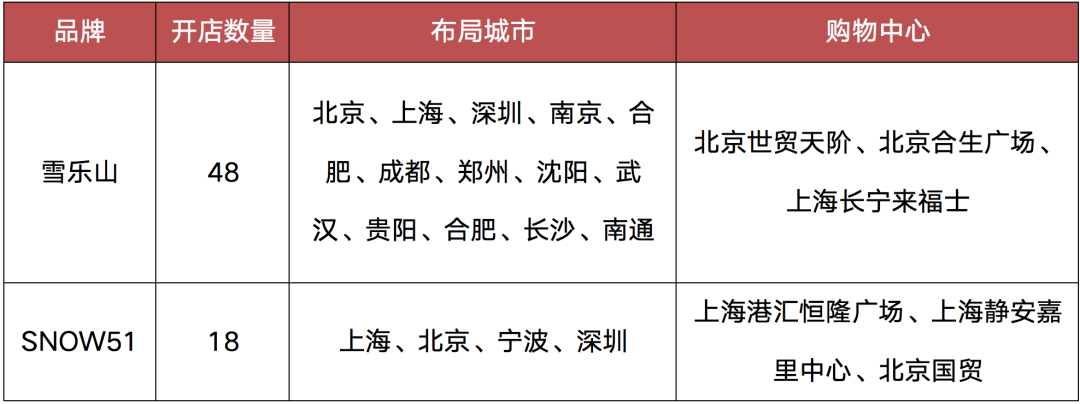 以雪樂(lè)山為例,店型分為主力店(600~800平)和迷你店(100平),主力店選址于購(gòu)物中心,單店投入300萬(wàn),資金回籠周期6到12個(gè)月,主要布局在一線城市,并向二線城市下沉。而SNOW51則采取會(huì)員制高端路線布局一線城市核心商圈,在滑雪運(yùn)動(dòng)的基礎(chǔ)上,增加了與品牌聯(lián)營(yíng)的零售、社交和餐飲服務(wù)。