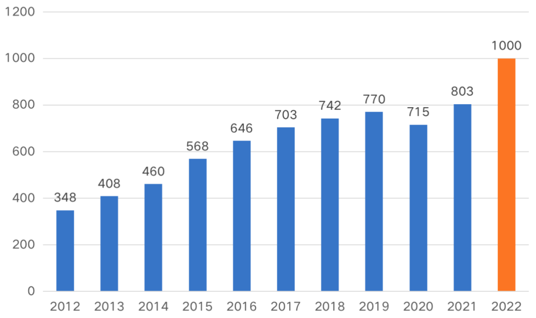國(guó)家體育總局相關(guān)數(shù)據(jù)顯示,2015年全國(guó)滑雪場(chǎng)數(shù)量為568家,2019年這個(gè)數(shù)字達(dá)到了770家,由于2020年疫情,滑雪場(chǎng)規(guī)模出現(xiàn)小幅下降,減少至715家,預(yù)計(jì)2022年滑雪場(chǎng)數(shù)量將實(shí)現(xiàn)新一輪增長(zhǎng),全國(guó)范圍內(nèi)滑雪場(chǎng)數(shù)量將達(dá)到1000余家。