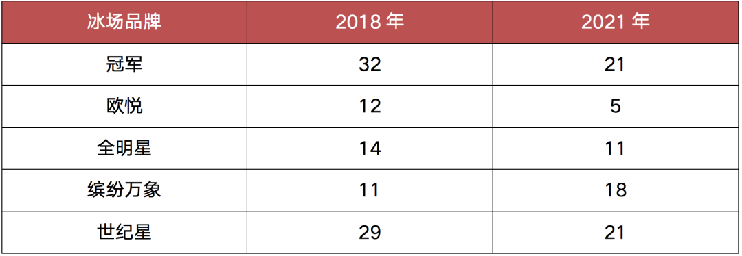 表:連鎖商業(yè)冰場(chǎng)品牌2018年與2021年店面數(shù)量對(duì)比