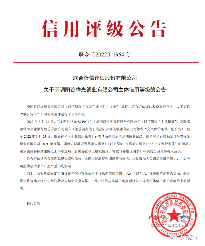 公告顯示,截至2022年3月23日,陽谷祥光《企業(yè)信用報告》存在7條未能清償?shù)狡趥鶆沼涗?,已觸發(fā)《陽谷祥光銅業(yè)有限公司2021年度第一期超短期融資券募集說明書》“交叉保護條款”。