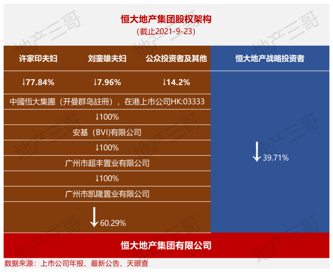 目前,上市公司中國(guó)恒大(HK:03333)對(duì)恒大地產(chǎn)集團(tuán)持股比例為60.29%,其中:許家印夫婦對(duì)恒大地產(chǎn)集團(tuán)的持股比例為46.93%;戰(zhàn)略投資者對(duì)恒大地產(chǎn)集團(tuán)的持股比例為:39.71%。