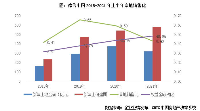 下半年拿地力度收縮明顯,新增土儲權(quán)益比例48%。2021年全年,德信中國共斬獲32宗土地,新增土儲投資總額318.0億元,新增土儲建面581.1萬平方米。拿地銷售比0.43,超出百強房企平均的0.25。主要是上半年拿地較多,下半年以來企業(yè)僅斬獲5幅土地,收縮明顯。權(quán)益方面,按拿地總價口徑,2021年德信新增土儲權(quán)益比例依然在50%以下,為48.0%,新增項目中僅1個為全資。一直以來,德信的權(quán)益占比都比較低,雖然這種模式能夠幫助企業(yè)短期沖刺業(yè)績,但是同時也大量侵蝕企業(yè)收入,造成空心化的增長。