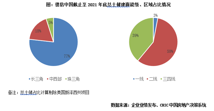 【土儲可滿足3年所需,長三角占比77%】截至2021年底,德信共擁有土地儲備1913.0萬平方米,較2020年底略有下降。按照企業(yè)目前的開發(fā)銷售以及增長節(jié)奏,可以滿足3年左右的發(fā)展需要。以建筑面積口徑計算,二線城市占比最高達到58%,三四線城市為39%,區(qū)域分布上,長三角區(qū)域占比高達77%,杭州作為德信大本營,單城占比達到了27.9%,溫州、寧波次之,占比達到9.9%及9.0%。