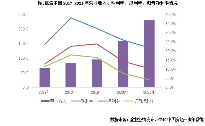 【營收與規(guī)模差異大,盈利能力接連下降】2021年德信實現(xiàn)營業(yè)收入231.1億元,同比增長45.6%,其中物業(yè)開發(fā)收入229.3億元,占集團總收入的99.2%。以營業(yè)收入/銷售規(guī)模來看,2020年德信這一比例僅有25%,低于百強上市房企2020年46%平均水平的21個百分點,今年該比例依然很低,只有31%。2021年德信中國實現(xiàn)毛利潤50.1億元,同比上升22.0%,整體毛利率21.8%,同比下滑4.2個百分點。實現(xiàn)凈利潤23.8億元,凈利率10.3%,相較2020年同期下滑3.9個百分點,實現(xiàn)歸母凈利潤9.4億元,歸母凈利率僅4.1%。從盈利能力來說,企業(yè)的各項指標已經(jīng)連續(xù)3年出現(xiàn)下滑,尤其是大量的合作項目侵蝕收入,導(dǎo)致企業(yè)歸母凈利率只有4.1%