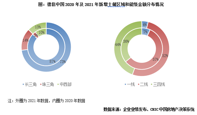外拓加強,聚焦一二線及長三角、珠三角三四線。德信始終堅持立足浙江,深耕長三角,聚焦四大都市圈的布局策略。以金額口徑計算,2021年新增土儲中73%位于長三角區(qū)域,相較2020年下降14個百分點,但仍居于首位。外拓方面主要是在珠三角和中西部兩區(qū)域投資提升,其中珠三角區(qū)域重點布局了漳州、廣州、佛山三城,占比提升11個百分點至14%。城市能級方面,二線仍是德信布局的重點核心,拿地金額占比達52%,較2020年略有下降,三四線城市拿地金額上升至44%,但均位于長三角和珠三角。