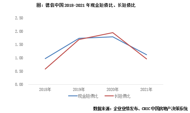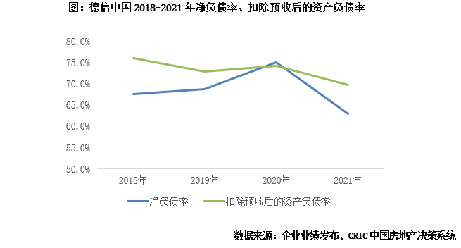 債務(wù)指標優(yōu)化,剔預(yù)資產(chǎn)負債率降至監(jiān)管線以下。根據(jù)企業(yè)公告,截至2021年底,德信的凈負債率為63%,相較2020年底下降,剔除預(yù)售賬款后資產(chǎn)負債率為69.6%,成功降至監(jiān)管標準的70%以下,達到監(jiān)管要求。