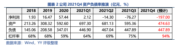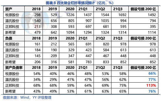 公司本就規(guī)模小、杠桿率高、前期累計(jì)的利潤(rùn)少,先天底子薄,而公司又踏錯(cuò)周期,20-21Q1高位繼續(xù)激進(jìn)擴(kuò)張,進(jìn)一步積累了債務(wù)負(fù)擔(dān)。當(dāng) 2021年2季度豬肉價(jià)格急速下滑后,公司的報(bào)表全面惡化,預(yù)計(jì)21年末資產(chǎn)負(fù)債率將突破90%,凈資產(chǎn)僅剩27億左右,陷入財(cái)務(wù)危機(jī)中。