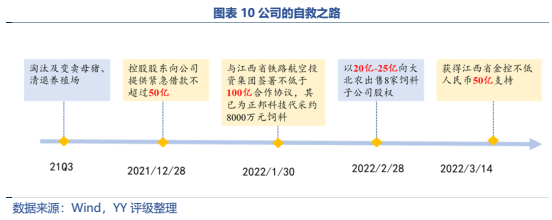 財(cái)務(wù)逐步惡化后,公司通過賣母豬、賣資產(chǎn)努力斷臂求生,后又積極尋求股東、外部政府的援助,可用之牌都打了一遍,目前已經(jīng)獲得200億左右的外部支援,本輪周期預(yù)計(jì)可以熬過,僅存的0.6億信用債大概率可以償付。