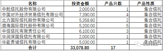 根據界面新聞的報道,“17騰邦01”債券違約之后的訴訟,泄露出13家機構名單(報道詳見https://www.jiemian.com/article/6122466.html)。而讓債券民工很意外的是,這13家機構名單中,共有7家信托公司,涉及了17只集合信托產品!債券民工根據公開信息整理了這7家信托公司在“17騰邦01”中的具體投資情況,詳見下表: