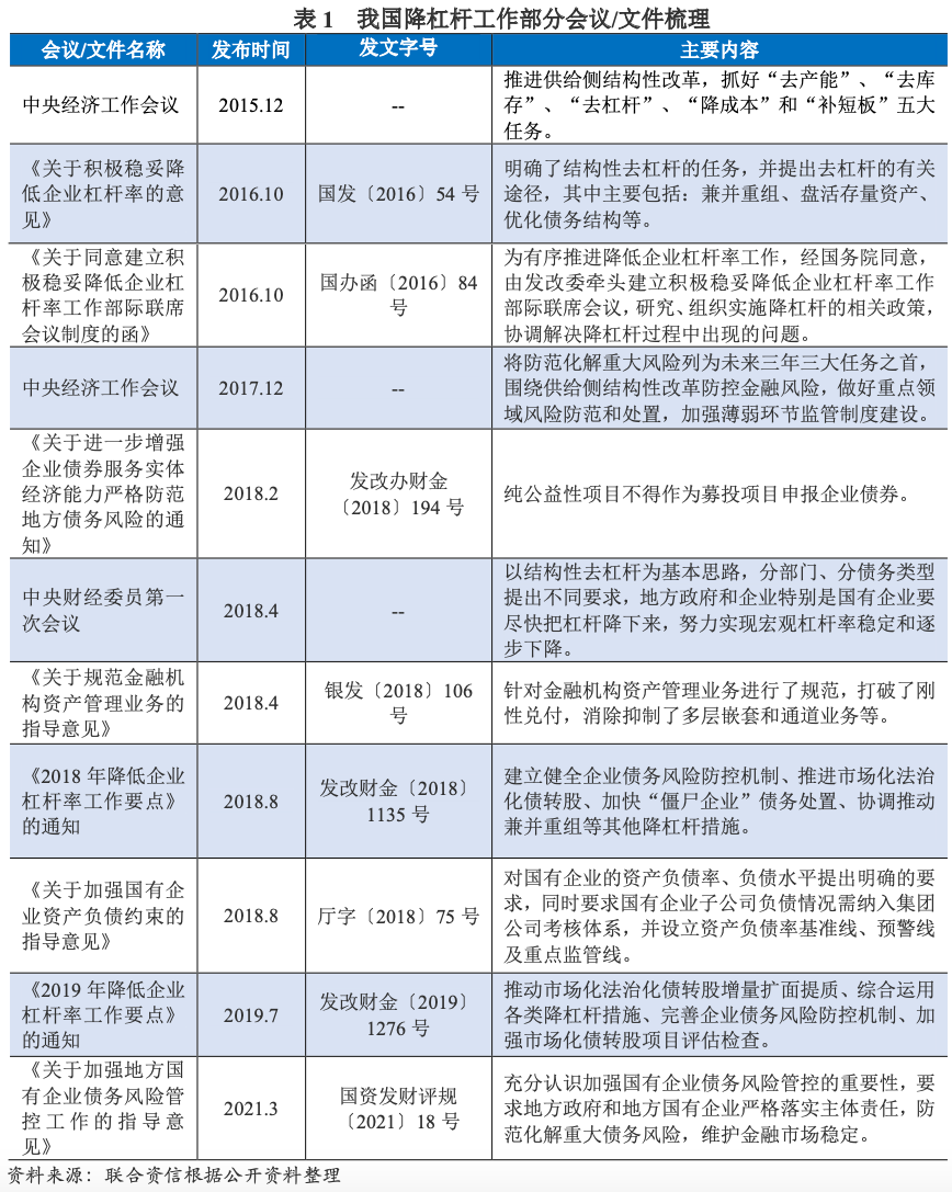 2015年12月,中央經(jīng)濟(jì)工作會(huì)議將結(jié)構(gòu)性改革作為經(jīng)濟(jì)社會(huì)發(fā)展的首要目標(biāo),提出“去產(chǎn)能”、“去庫存”、“去杠桿”、“降成本”和“補(bǔ)短板”五大任務(wù);2016年10月,中華人民共和國國務(wù)院(以下簡稱“國務(wù)院”)發(fā)布《國務(wù)院關(guān)于積極穩(wěn)妥降低企業(yè)杠桿率的意見》的去杠桿綱領(lǐng)性文件;2017年,中國共產(chǎn)黨第十九次全國代表大會(huì)后,防范風(fēng)險(xiǎn)正式成為了我國經(jīng)濟(jì)工作的主要基調(diào),降杠桿則是供給側(cè)結(jié)構(gòu)性改革中的主要任務(wù)之一。2018年,我國政府及相關(guān)部門陸續(xù)印發(fā)相應(yīng)文件,降杠桿相關(guān)政策環(huán)境持續(xù)趨嚴(yán)。2021年3月,中華人民共和國國務(wù)院國有資產(chǎn)監(jiān)督管理委員會(huì)(以下簡稱“國資委”)印發(fā)《關(guān)于加強(qiáng)地方國有企業(yè)債務(wù)風(fēng)險(xiǎn)管控工作的指導(dǎo)意見》(國資發(fā)財(cái)評規(guī)〔2021〕18號(hào)),指出要充分認(rèn)識(shí)加強(qiáng)國有企業(yè)債務(wù)風(fēng)險(xiǎn)管控的重要性,監(jiān)管企業(yè)債務(wù)及風(fēng)險(xiǎn)管控工作仍未松動(dòng)。