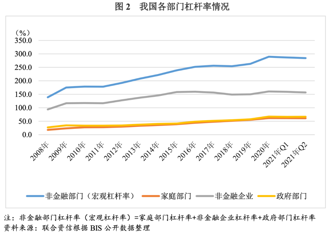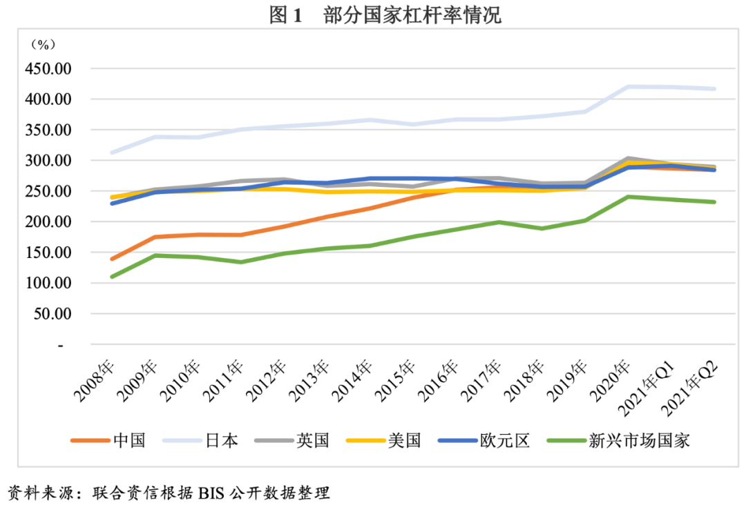 我國宏觀杠桿率經(jīng)過早年的快速提升,截至2020年底已達(dá)289.6%,與英國、美國和歐元區(qū)國家水平基本相當(dāng)。2021年上半年,我國宏觀杠桿率再次回落;2021年6月底我國宏觀杠桿率較2020年底下降4.9個(gè)百分點(diǎn)至284.7%,在BIS統(tǒng)計(jì)公布的44個(gè)國家和地區(qū)當(dāng)中處于第20位(按宏觀杠桿率由高到低排序)。