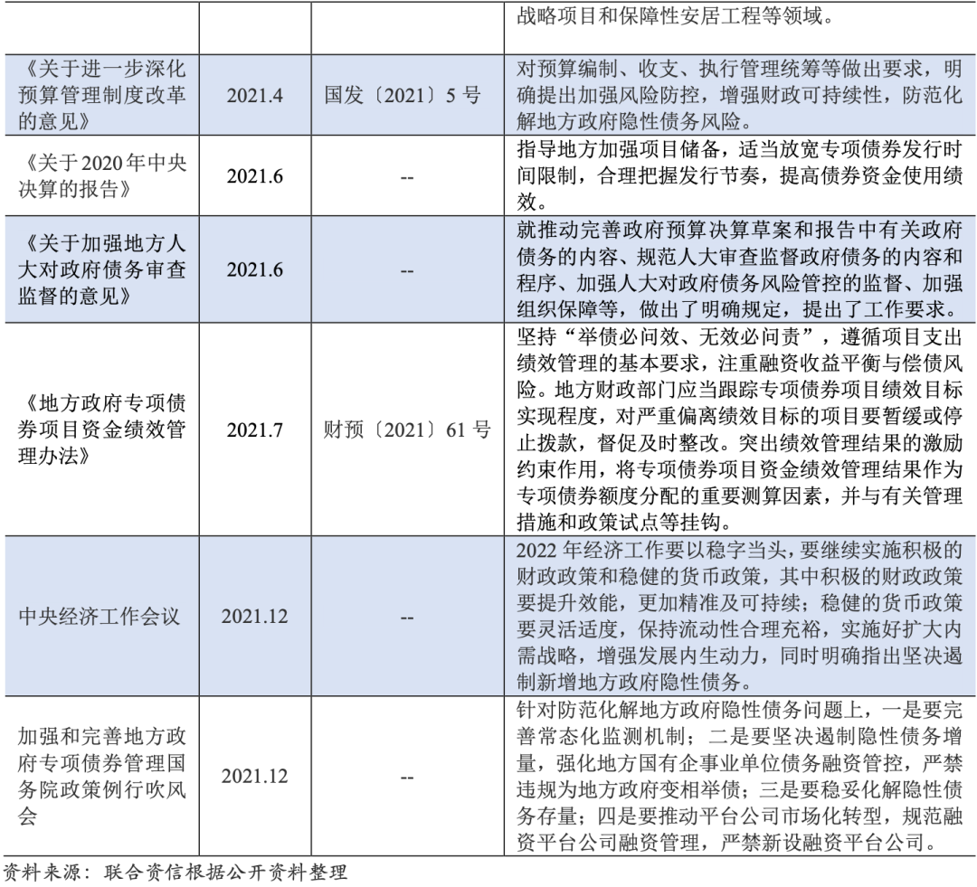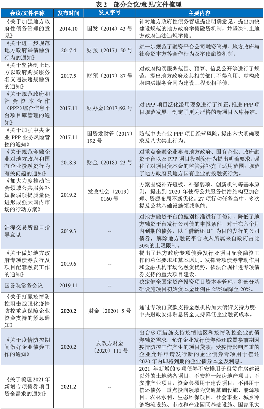 2008年全球金融危機(jī)爆發(fā),我國政府為進(jìn)一步擴(kuò)大內(nèi)需、促進(jìn)經(jīng)濟(jì)平穩(wěn)較快增長,安排了總規(guī)模達(dá)4萬億元的中央投資資金,投向主要為保障性住房、棚戶區(qū)改造、鐵路、公路、機(jī)場、水利、醫(yī)療衛(wèi)生、教育等基礎(chǔ)設(shè)施建設(shè)。基礎(chǔ)設(shè)施建設(shè)投資作為我國拉動(dòng)內(nèi)需穩(wěn)定經(jīng)濟(jì)的重要途徑,城投企業(yè)在這當(dāng)中起到了重要作用,但大規(guī)模的投資計(jì)劃也使得城投企業(yè)所負(fù)擔(dān)的債務(wù)快速上升。2014-2018年間,我國針對地方政府和城投企業(yè)的相關(guān)政策監(jiān)管均較為嚴(yán)格,在防范化解地方政府債務(wù)風(fēng)險(xiǎn)的同時(shí)也逐步規(guī)范了地方政府及地方國有企業(yè)的投融資行為。2019年,宏觀經(jīng)濟(jì)下行壓力加大,滬深交易所窗口指導(dǎo)放松了對城投公司的發(fā)債限制;2020年,新冠肺炎疫情全球化流行,我國在防范風(fēng)險(xiǎn)的同時(shí)也推行了適當(dāng)?shù)臄U(kuò)張政策拉動(dòng)內(nèi)需,穩(wěn)定經(jīng)濟(jì)增長,各項(xiàng)結(jié)構(gòu)性寬松的政策直接或間接地為城投企業(yè)提供了較好的再融資環(huán)境。2021年,各項(xiàng)政策對地方政府隱性債務(wù)的管控及債券資金的使用效率提出了新的要求,償債風(fēng)險(xiǎn)及地方政府隱性債務(wù)風(fēng)險(xiǎn)的防范化解工作持續(xù)實(shí)施。