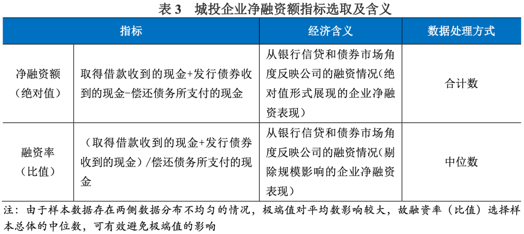 城投企業(yè)以銀行借款、債券發(fā)行等為主要融資形式,資金流入對應(yīng)體現(xiàn)在現(xiàn)金流量表中的“取得借款收到的現(xiàn)金”和“發(fā)行債券收到的現(xiàn)金”兩個(gè)科目[1],資金流出對應(yīng)體現(xiàn)在現(xiàn)金流量表中的“償還債務(wù)所支付的現(xiàn)金”科目。本文選取絕對值、比值兩個(gè)指標(biāo),展現(xiàn)城投企業(yè)的融資缺口情況。對于凈融資額(絕對值)指標(biāo)而言,零值是一個(gè)很重要的分界點(diǎn),當(dāng)指標(biāo)為正時(shí)表示企業(yè)債權(quán)形式融資資金流入量大于流出量;當(dāng)指標(biāo)為負(fù)時(shí)表示企業(yè)債權(quán)形式融資資金流入量小于流出量。融資率(比值)指標(biāo)在分母設(shè)置“償還債務(wù)所支付的現(xiàn)金”,主要考慮了企業(yè)規(guī)模對凈融資額的影響,1是該指標(biāo)的重要分界點(diǎn),當(dāng)指標(biāo)大于1時(shí)表示企業(yè)債權(quán)形式資金融入量大于償還量,小于1時(shí)表示企業(yè)債權(quán)形式資金償還量大于融入量。