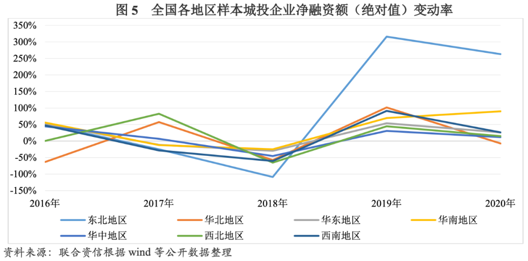 從區(qū)域分布來看,2015-2020年,華東、華南、西南地區(qū)樣本城投企業(yè)凈融資額(絕對值)變動(dòng)趨勢與全國樣本城投企業(yè)變動(dòng)趨勢大體一致。2016年降杠桿等綱領(lǐng)性文件印發(fā)后,上述三個(gè)地區(qū)紛紛響應(yīng),2017年凈融資額(絕對值)均較2016年有所減少,2018年受監(jiān)管政策持續(xù)收緊的影響,凈融資額(絕對值)分別降至2015年以來最低點(diǎn);此后兩年,我國加大逆周期調(diào)節(jié)力度,城投企業(yè)融資環(huán)境向好,華東、華南、西南地區(qū)樣本城投企業(yè)凈融資額(絕對值)保持增長。