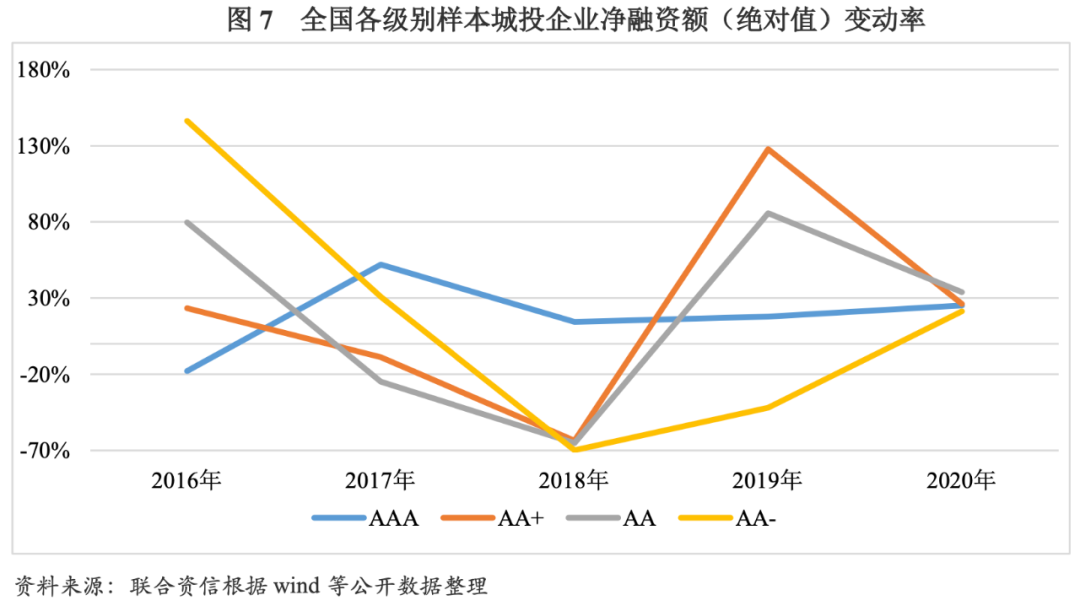 2015年至2021年上半年,樣本城投企業(yè)凈融資情況在絕對值和比值的表現(xiàn)形式下呈相同走勢,且與非金融企業(yè)杠桿率同趨勢變化。不同區(qū)域、信用級(jí)別樣本城投企業(yè)凈融資情況對監(jiān)管政策寬松程度的敏感及響應(yīng)速度有所不同,其中所在區(qū)域經(jīng)濟(jì)相對較弱、信用級(jí)別較低的樣本城投企業(yè)在監(jiān)管政策趨緊時(shí),外部融資環(huán)境更為嚴(yán)峻;區(qū)域經(jīng)濟(jì)相對較強(qiáng)、信用級(jí)別較高的樣本城投企業(yè)在嚴(yán)監(jiān)管下韌性較強(qiáng)。