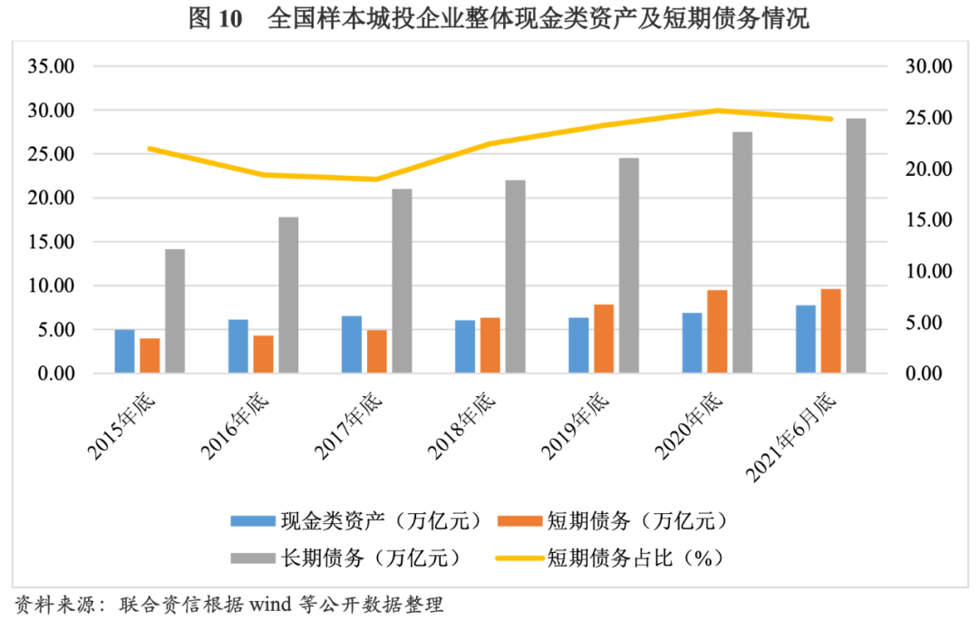 2015-2020年,樣本城投企業(yè)整體現(xiàn)金類資產(chǎn)由2015年底的4.96萬億元增至2020年底的6.88萬億元,年均復(fù)合增長8.50%,增長較為平穩(wěn);短期債務(wù)由2015年底的3.98萬億元增至2020年底的9.50萬億元,年均復(fù)合增長24.29%,增速較快,主要原因?yàn)槌峭镀髽I(yè)陸續(xù)進(jìn)入償債高峰期,從而導(dǎo)致城投企業(yè)短期償債壓力不斷攀升。從樣本城投企業(yè)整體債務(wù)結(jié)構(gòu)看,2015-2020年,樣本城投企業(yè)短期債務(wù)占比以2017年為拐點(diǎn)呈持續(xù)上升態(tài)勢,由2017年底的18.95%升至2020年底的25.65%,側(cè)面反映出城投企業(yè)新融資獲得的資金期限有所縮短,在宏觀審慎和降杠桿的大背景下,各類金融機(jī)構(gòu)及債券投資者對城投企業(yè)整體持觀望態(tài)度,對給予城投企業(yè)長期限資金支持的態(tài)度更加謹(jǐn)慎。