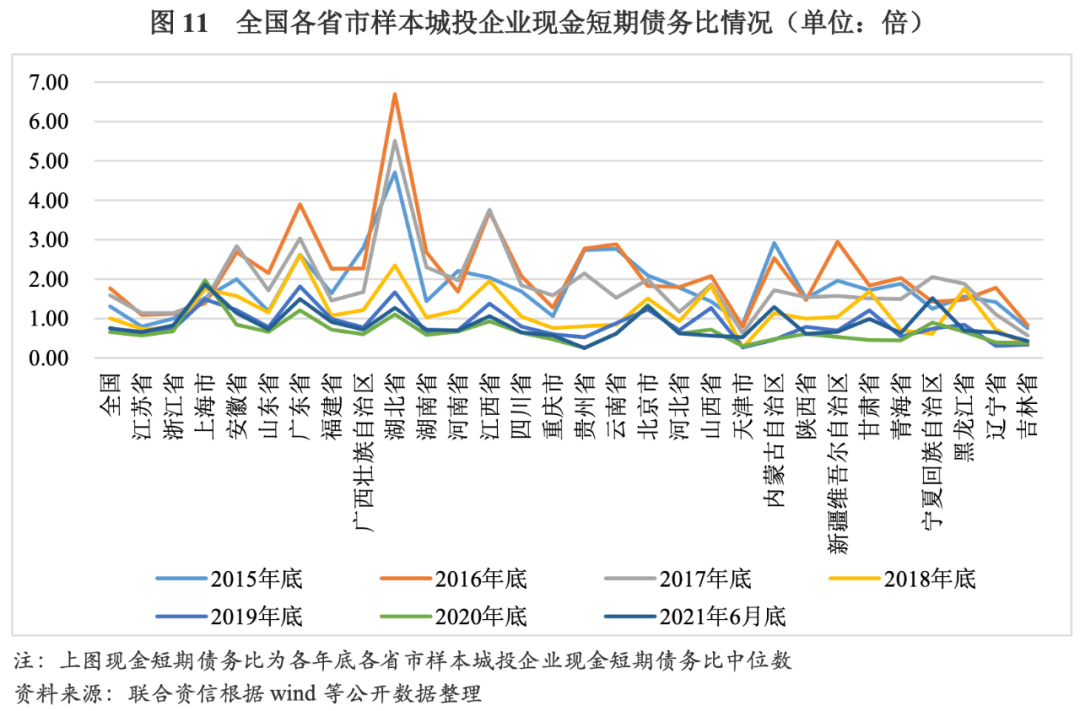 2015-2016年,全國信用政策較為寬松,2015年底和2016年底樣本城投企業(yè)現(xiàn)金短期債務(wù)比分別為1.31倍和1.77倍,整體流動(dòng)性水平尚可。2017-2020年,在降杠桿背景下,樣本城投企業(yè)現(xiàn)金短期債務(wù)比呈逐年下降趨勢,由2017年底的1.59倍降至2020年底的0.66倍,城投企業(yè)流動(dòng)性持續(xù)趨緊。其中,在監(jiān)管政策大幅收緊的2018年,樣本城投企業(yè)流動(dòng)性壓力顯著增加。2021年6月底,樣本城投企業(yè)現(xiàn)金短期債務(wù)比較2020年底有所上升,但仍存在一定流動(dòng)性壓力。