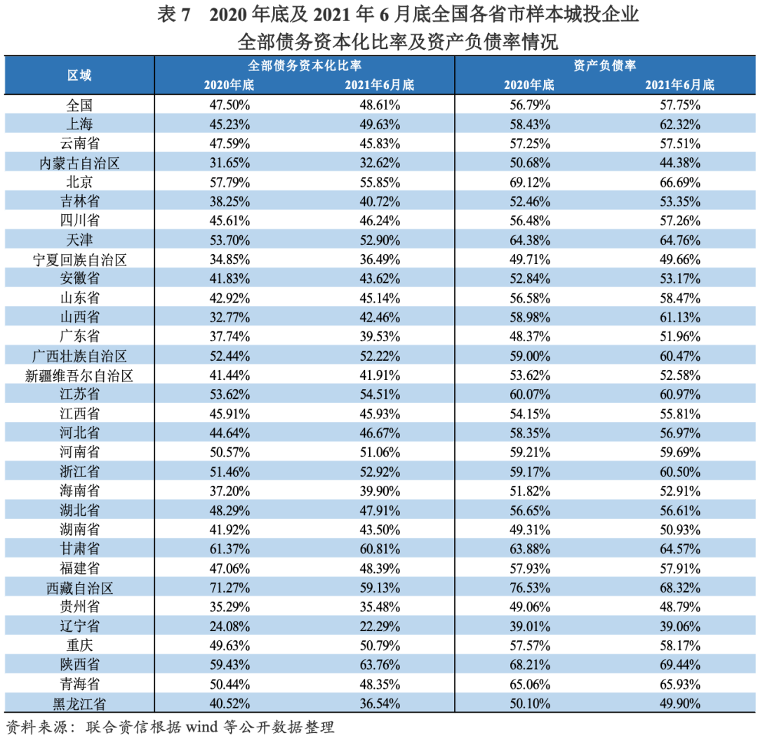 從區(qū)域分布來看,2015-2020年及2021年6月底,在降杠桿背景下各省市樣本城投企業(yè)資產(chǎn)負(fù)債率、全部債務(wù)資本化比率變化趨勢相近,大部分省市呈上升趨勢,但增速開始走緩。其中,地區(qū)生產(chǎn)總值在全國排名前列的區(qū)域,因融資渠道較寬,其城投債發(fā)行規(guī)模也較大,如江蘇、浙江、山東、湖南、四川等區(qū)域,資產(chǎn)負(fù)債率和全部債務(wù)資本化比率上升趨勢較平穩(wěn)。同期,經(jīng)濟(jì)實(shí)力較弱的地區(qū)如遼寧、內(nèi)蒙古、天津、海南,當(dāng)?shù)貥颖境峭镀髽I(yè)普遍存在較大的融資壓力,資產(chǎn)負(fù)債率及全部債務(wù)資本化比率均呈下降趨勢。