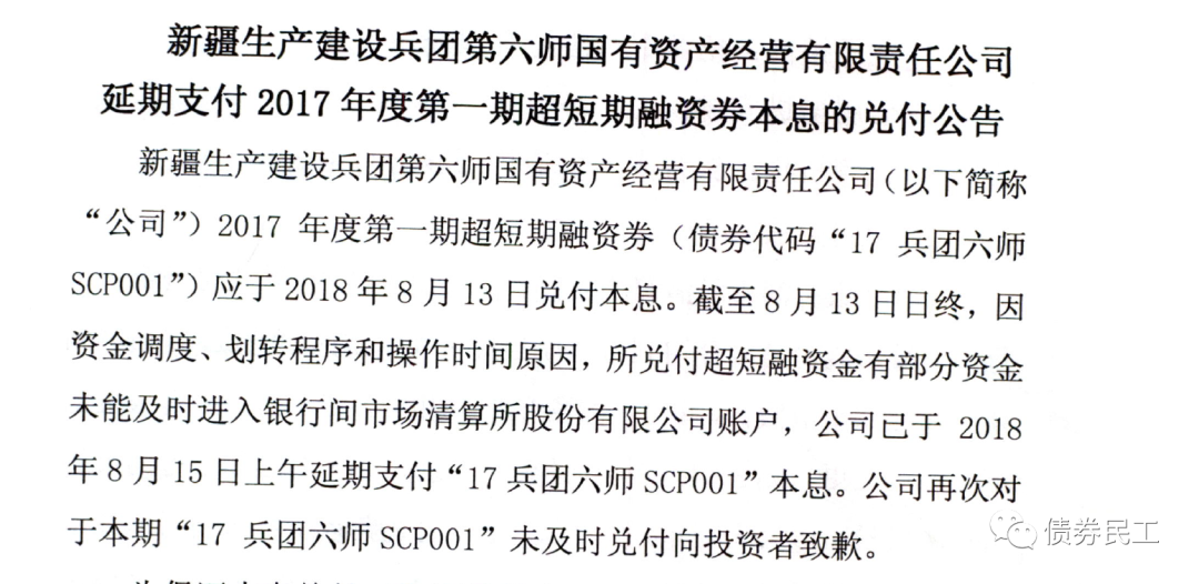 2018年8月15日上午,新疆生產建設兵團第六師國有資產經營有限責任公司發布公告,已經將“17兵團六師SCP001”的債券本息足額支付到上清所。