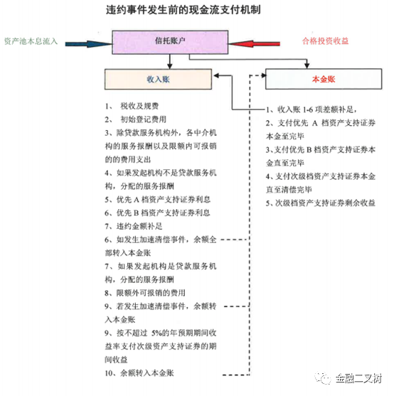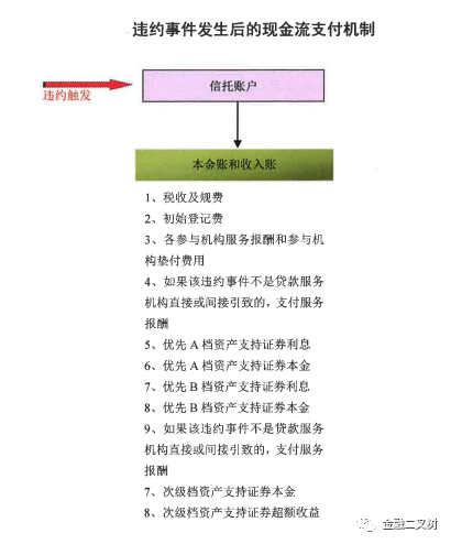 上圖所示產品有A、B檔兩個層級及次級,當出現(xiàn)違約事件后,償付順序是優(yōu)先A檔本金、利息 優(yōu)先B檔本金、利息 次級本金及超額收益。當優(yōu)先A檔本息正常兌付時,而B檔本息無法正常兌付時,優(yōu)先B檔發(fā)生實質違約,而當次級本金損失,而優(yōu)先A、B檔正常兌付本息時,小編認為沒有發(fā)生實質違約,風險事件會影響現(xiàn)金流分配但不一定導致違約。