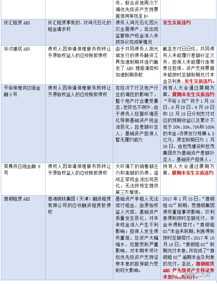 當現(xiàn)金流惡化時,到期現(xiàn)金流不足以支付優(yōu)先級本息時,觸發(fā)增信措施,這時候通常不認為發(fā)生違約,而是觸發(fā)風險事件,當所有增信措施不足以覆蓋優(yōu)先級本息時,我們認為ABS產品發(fā)生實質違約。