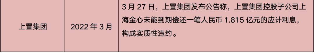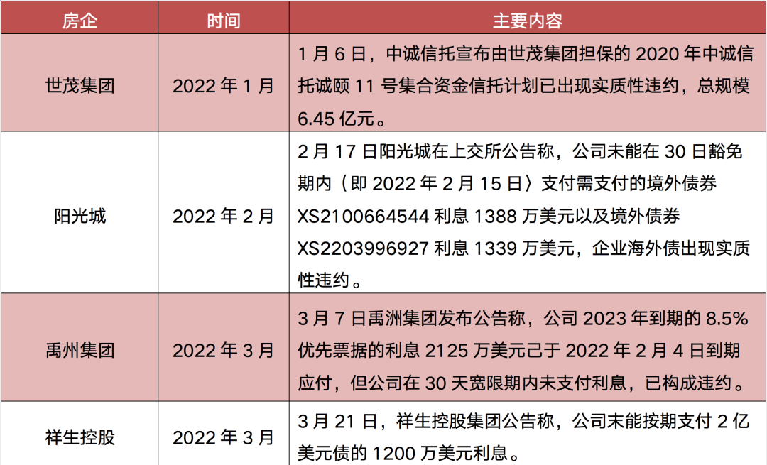 截止至2022年3月,已有多個企業債務違約,如世茂集團、陽光城、禹州集團、祥生控股、上置集團。與此同時,CAIC監測數據顯示,2022年4月有32筆債券到期,合計510.10億。