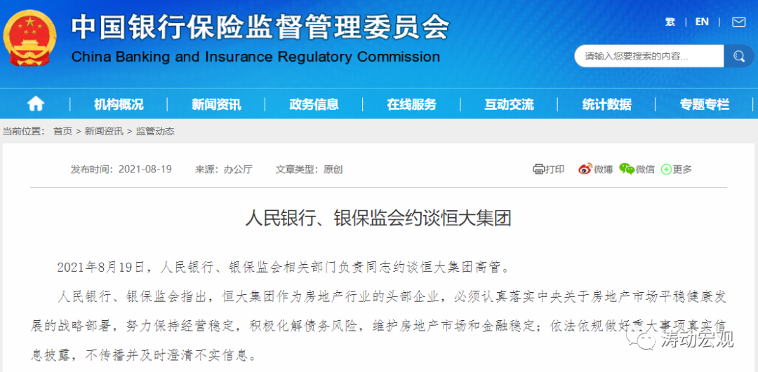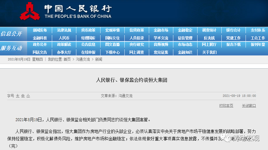 2021年8月19日,央行和銀保監(jiān)會(huì)官網(wǎng)發(fā)文“人民銀行、銀保監(jiān)會(huì)約談恒大集團(tuán)”。