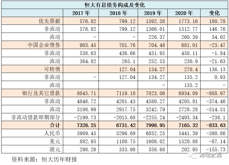 2、從有息債務(wù)的結(jié)構(gòu)來(lái)看,從高到低依次為銀行及其它借款、優(yōu)先票據(jù)、企業(yè)債券以及可轉(zhuǎn)債等四個(gè)部分,2020年全年銀行及其它借款累計(jì)壓降了888.97億元,是恒大有息債務(wù)壓降的主要部分。