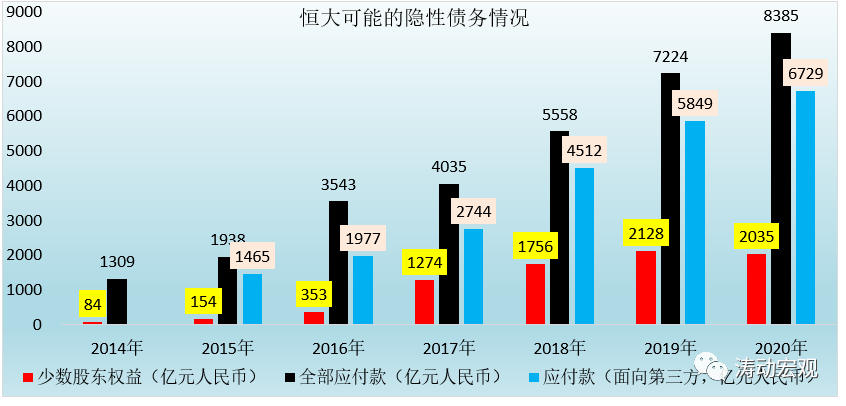恒大的債務(wù)還包括“明股實(shí)債”和上下游的應(yīng)付款(包括需要兌付的各類(lèi)商業(yè)票據(jù)等)兩大隱性債務(wù),其中“明股實(shí)債”主要體現(xiàn)在少數(shù)股東權(quán)益科目中,而應(yīng)付款雖非有息、但也是相對(duì)可觀的支出,對(duì)恒大的現(xiàn)金流影響較大。