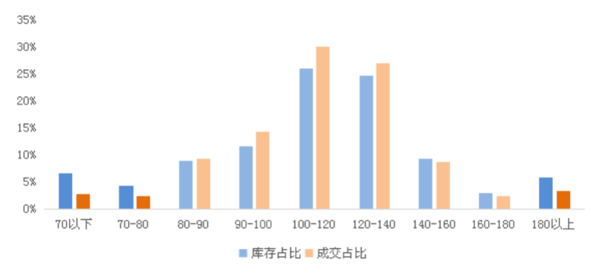 從成交占比情況這一面積段同樣也是成交主力,從中長期來看,無論是二孩還是人們對居住舒適度的追求,大面積段都將占據主流市場,因此這部分庫存極有可能在后期銷售中轉化為成交。