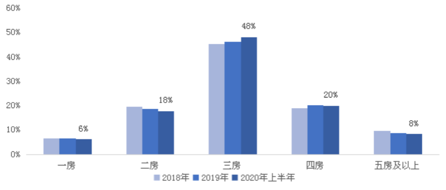 近3年對比而言,三房、四房庫存占比上揚,其余房型占總體存量比重均下降。具體而言,2020年上半年末三房戶型庫存占比較2018年末顯著提升,比重提升了3個百分點;四房戶型3年間占比微增1%。其他戶型中,五房及以上戶型庫存占比下降最多,2020年上半年末較2018年末占比下降2個百分點;一房、二房戶型庫存占比則分別下降1個百分點。
