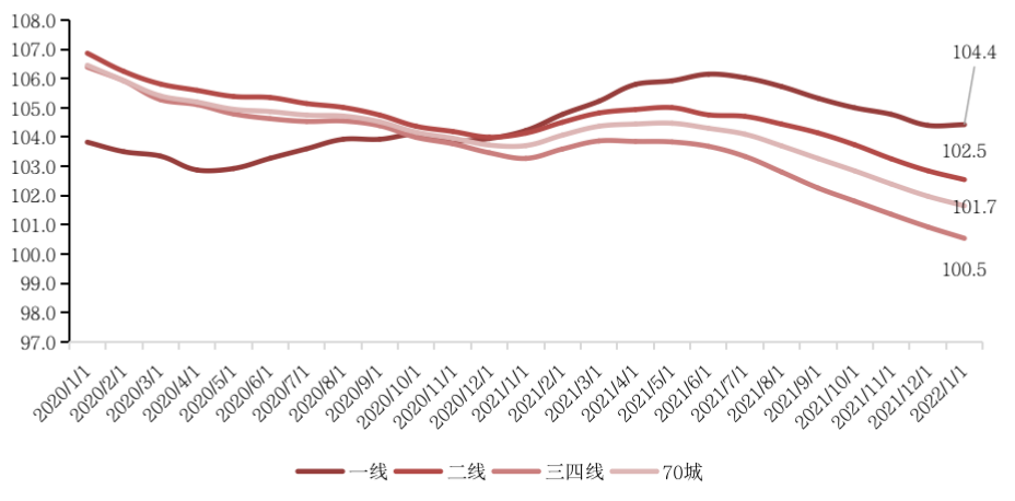 這主要是由于受2021年下半年市場下行影響,至2022年1月三四線城市二手住宅價格仍有0.7%的同比降幅。二手房市場不振下三四線城市購房者不具備充足的購房資金和心理預(yù)期投入新房市場。