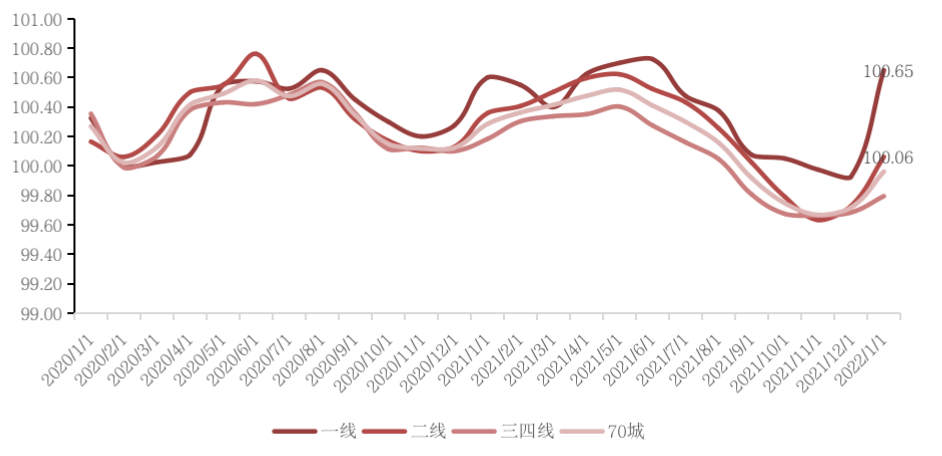 一線城市表現(xiàn)出強(qiáng)勁活力,房價同比出現(xiàn)相反上揚(yáng)。1月4城整體同比上升4.4%,較上月漲幅不縮反擴(kuò)0.02pcts。二線和三四線城市與70城整體走勢一致,同比分別上漲2.5%和0.5%,漲幅分別較上月收窄0.3pcts和0.4pcts。