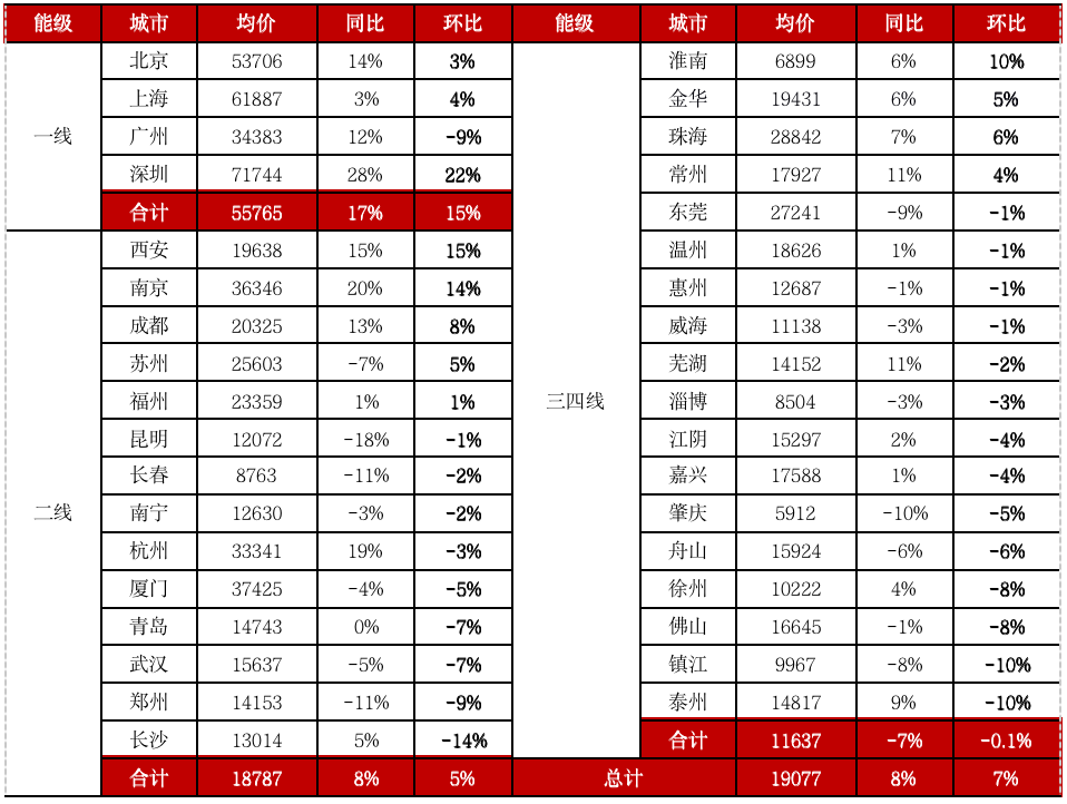 具體來看,一線城市中北京、上海、廣州和深圳分別環(huán)比上漲1.0%、0.6%、0.5%和0.5%;二線城市中16城環(huán)比上漲,重慶漲幅最大達(dá)0.9%,寧波、武漢、濟(jì)南、南寧、貴陽、昆明等多城為半年內(nèi)首度環(huán)比回正。
