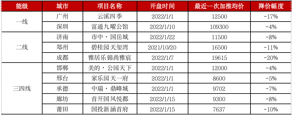 表:2022年典型城市1月部分降價項(xiàng)目(元/平方米、%)
