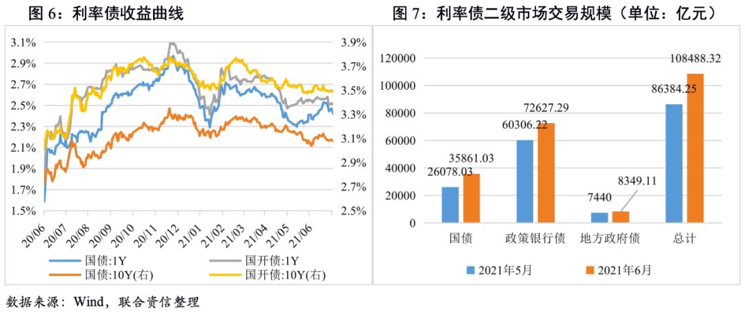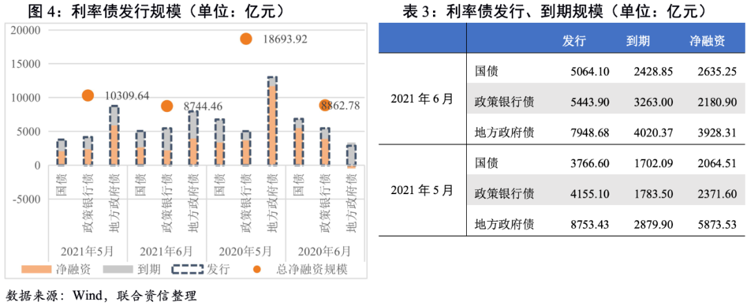 2021年6月,利率債總發行規模環比小幅上升,凈融資規模環比下降,凈融資規模較去年同期小幅減少。從發行節奏看,截至6月30日,國債供給進度顯著慢于往年同期,下半年國債將呈現加快供給的特征;政策性銀行債發行基本符合歷史發行節奏,預計下半年將保持往年節奏;地方政府債方面,由于2021年專項債額度下發較晚導致地方政府債發行節奏也慢于往年,下半年仍有3萬億左右的新增地方債待發,其中新增一般債大約3500億,新增專項債大約2.65萬億。6月28日財政部下發《地方政府專項債券項目資金績效管理辦法》對專項債券資金預算執行進度和績效目標實現情況進行“雙監控”,進一步規范了地方政府專項債券的資金使用。根據歷年發行節奏以及現有地方政府發布的三季度地方債發行計劃來看,今年地方政府債發行節奏大概率依然是三季度發行規模大于四季度。整體看,下半年利率債發行規模較上半年將有所增加。