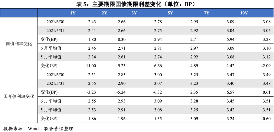 6月利率債收益率先漲后跌。6月上半月二級市場利率債收益率震蕩上行;下半月央行加大公開市場投放后,二級市場利率債收益率小幅下行。截至6月30日,利率債收益率較5月31日小幅上行。十年及以內期限的國債中,除十年期國債外,其余期限國債收益率月度均值較5月小幅上行。