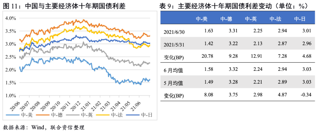 截至6月末,我國與主要經濟體的利差較5月末均進一步走闊,其中與美國的利差上升幅度最大。6月美國十年期國債收益率整體呈震蕩下行走勢,由1.58%下行至1.45%,主要是由于月初非農就業不及預期,市場修正對前期經濟增長樂觀的預期。三季度美國經濟預期較為樂觀,同時美聯儲釋放鷹派信號疊加美國通脹超預期上行,綜上分析預計三季度美債收益率有望重回上行渠道,中美十年期國債利差或將有所收窄。除美國外,6月我國與德國、英國和法國的十年期國債利差均值均有所上升,與日本利差則小幅收窄,日本國債利率下行幅度小于我國。