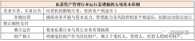 2、明確了賣者盡責、買者自負;審慎經營;禁止剛性兌付;獨立運作以及財產獨立等五項基本原則;