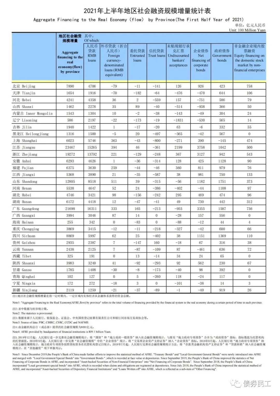 中國人民銀行于2021年8月2日披露了《2021年上半年地區(qū)社會(huì)融資規(guī)模增量統(tǒng)計(jì)表》,表中詳細(xì)披露了各個(gè)省市的債券融資增量情況(包括企業(yè)債券、公司債券和非金融企業(yè)債務(wù)融資工具等)。其中部分?jǐn)?shù)據(jù)還是需要特別關(guān)注的,具體數(shù)據(jù)情況詳見下表: