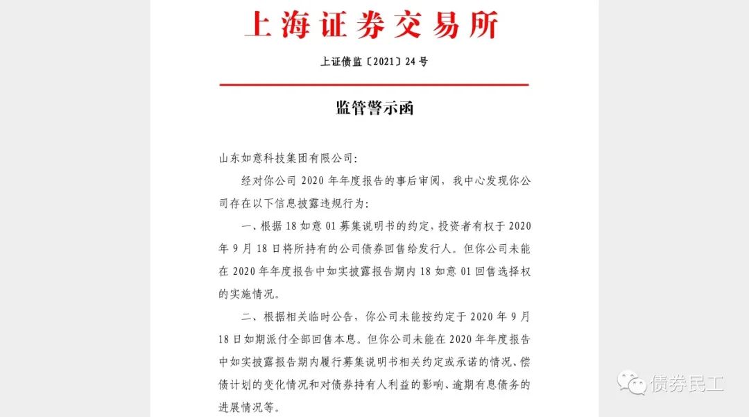 根據(jù)網(wǎng)站的公開信息,上海證券交易所于2021年5月16日向山東如意科技集團有限公司(以下簡稱“如意集團”)出具監(jiān)管警示函,主要原因是未能披露18如意01的回售情況和未能在2020年度報告中如實披露應(yīng)履行的信息披露義務(wù)。