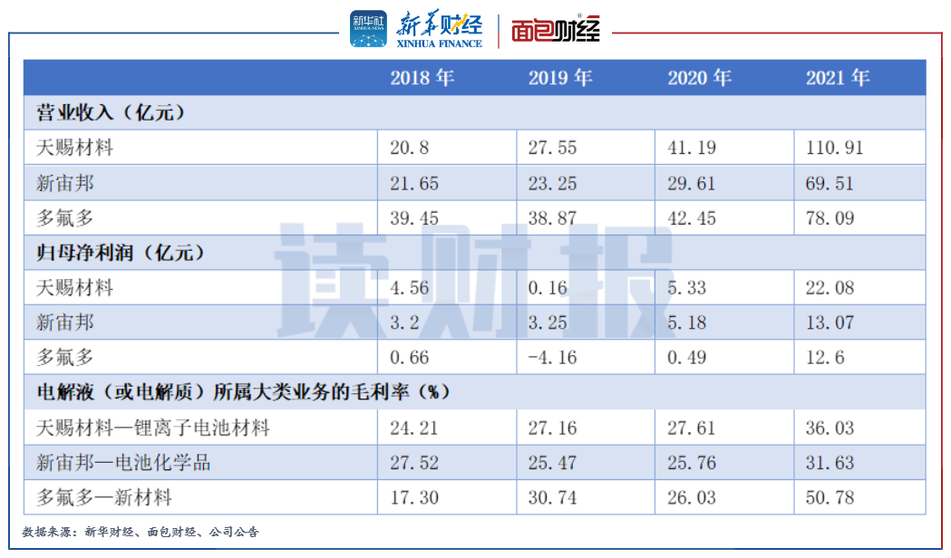 在鋰電電解液板塊中,行業(yè)領(lǐng)先公司多氟多、天賜材料和新宙邦已發(fā)布2021年年報(bào)。受益于下游鋰電池市場(chǎng)需求大幅增長,三家原材料公司的業(yè)績均顯著增長。