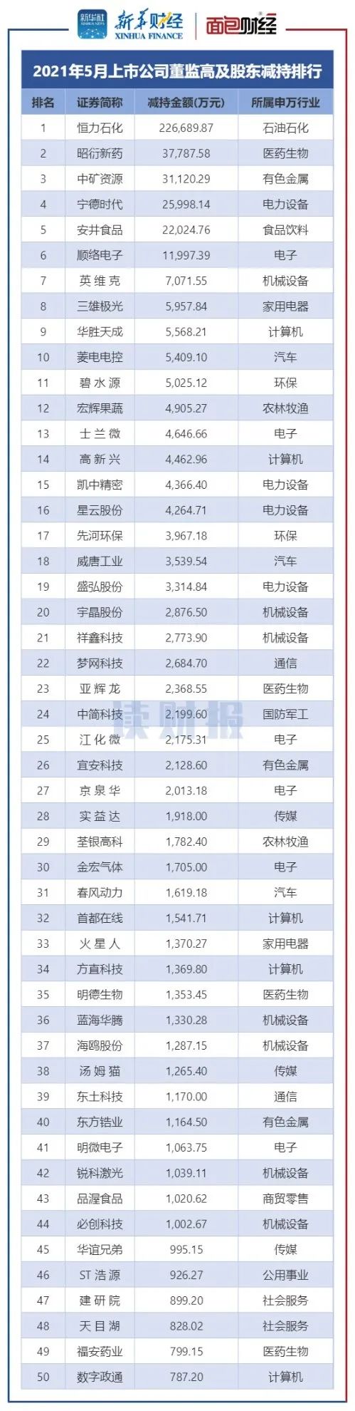 石油石化行業(yè)中,減持金額靠前的上市公司是恒力石化。信披數(shù)據(jù)顯示,恒力石化董事范紅衛(wèi)在5月減持金額約為22.67億元。