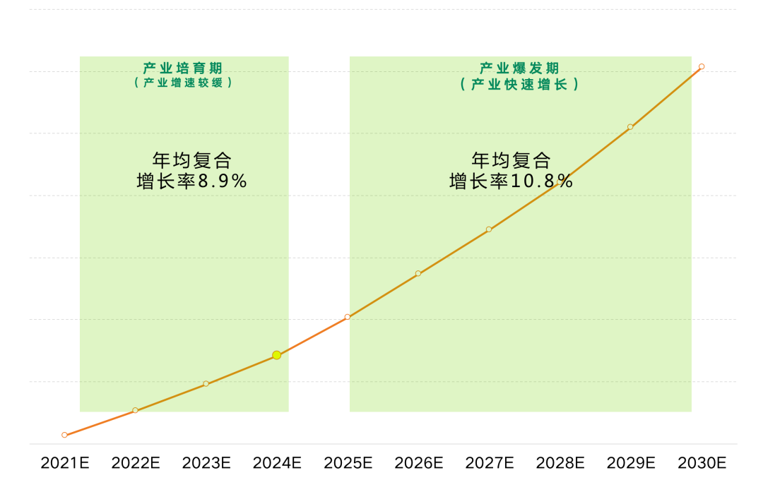 根據2020-2030年養老產業規模數值計算,2020-2024年養老產業規模復合增長率為8.9%,而2025-2030年養老產業復合增長率為10.8%,意味著未來五年養老產業將提前完成產業孵化,轉而邁入產業爆發期。